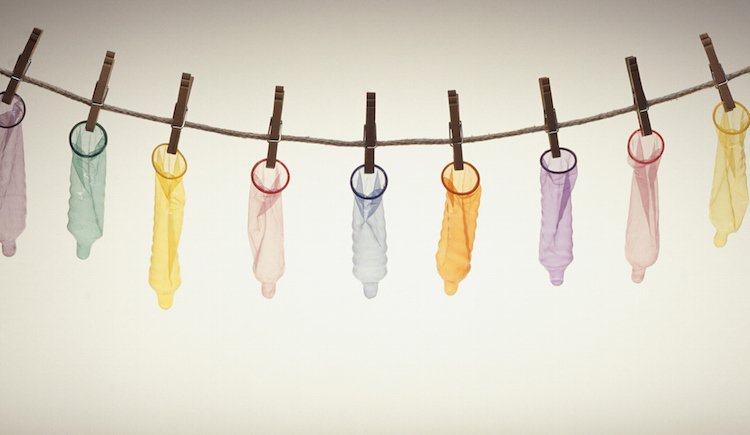 Condoms hanging on pegs from line. Photo: Keith Brofsky (Getty)