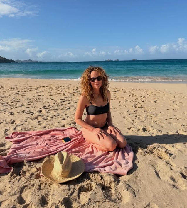 With her curly hair falling past her shoulders, the film icon showed off her figure with a two-piece bathing suit while on vacation. The only accessory she wore was a pair of shades, though her phone and woven beach hat could be found resting on the towel beside her.