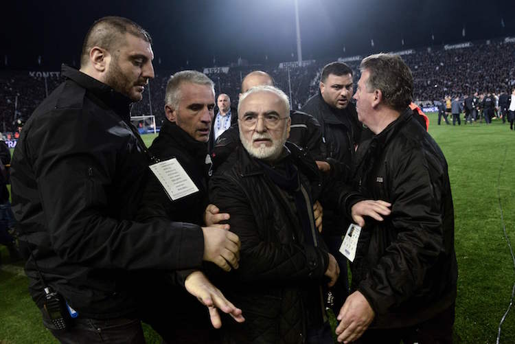 According to The Washington Post, PAOK owner Ivan Savvidis was pissed that the ref disallowed a goal in the 89th minute that would have pretty much wrapped up the game because of a sketchy offsides call, but instead of waiting to voice his displeasure at the presser following the game, he decided to “twice storm the field while armed with a holstered handgun and surrounded by bodyguards.”