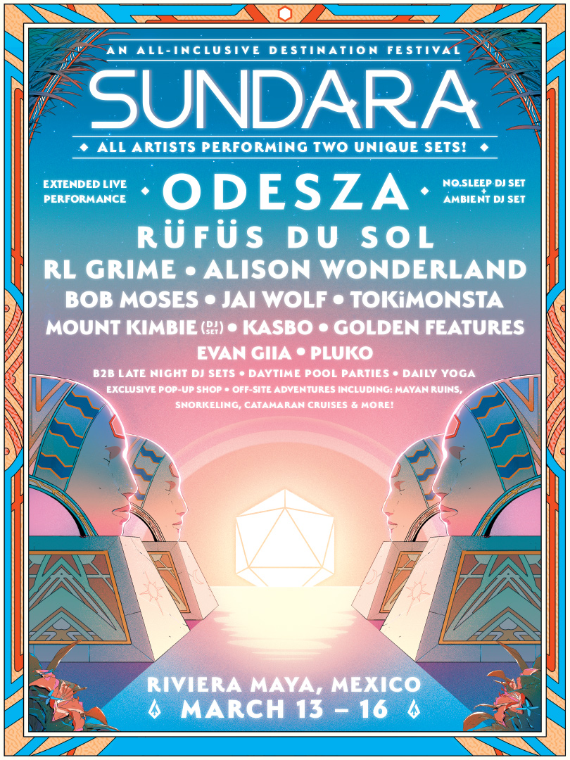 Sundara is a fantasy island adventure held in the Mexican Riviera that seems like a dream vacation for any music fan. This all-inclusive destination festival marches to its own BPMs with yoga classes and two unique sets by the likes of RÜFÜS DU SOL, Bob Moses, and festival hosts ODESZA.