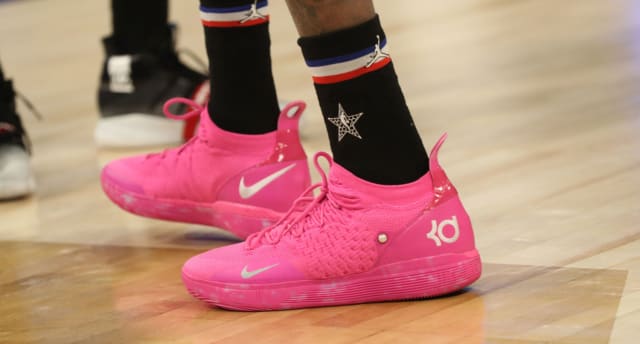 All-Star game? All-pink sneak. Dedicated to women battling cancer, MVP Kevin Durant's shoe, dubbed the "Aunt Pearl," is a straightforward, classic design kick with a purpose that pops.