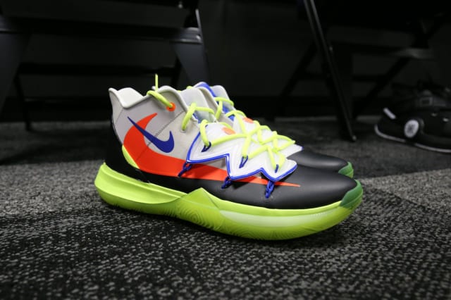 This basic-looking shoe seeks to highlight Kyrie Irving's footwork and handling with a neon yellow mid-sole holding up a black and white body with red and blue accents. With lines inspired by the ancient pyramids, the matching limestone laces left no doubt how Irving's magic moves lit up the court, scoring 13 points for Team LeBron.