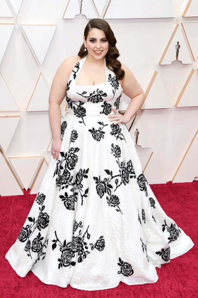 The hilarious Beanie Feldstein adds a little va-va-voom to the red carpet in her white gown with halter neckline.