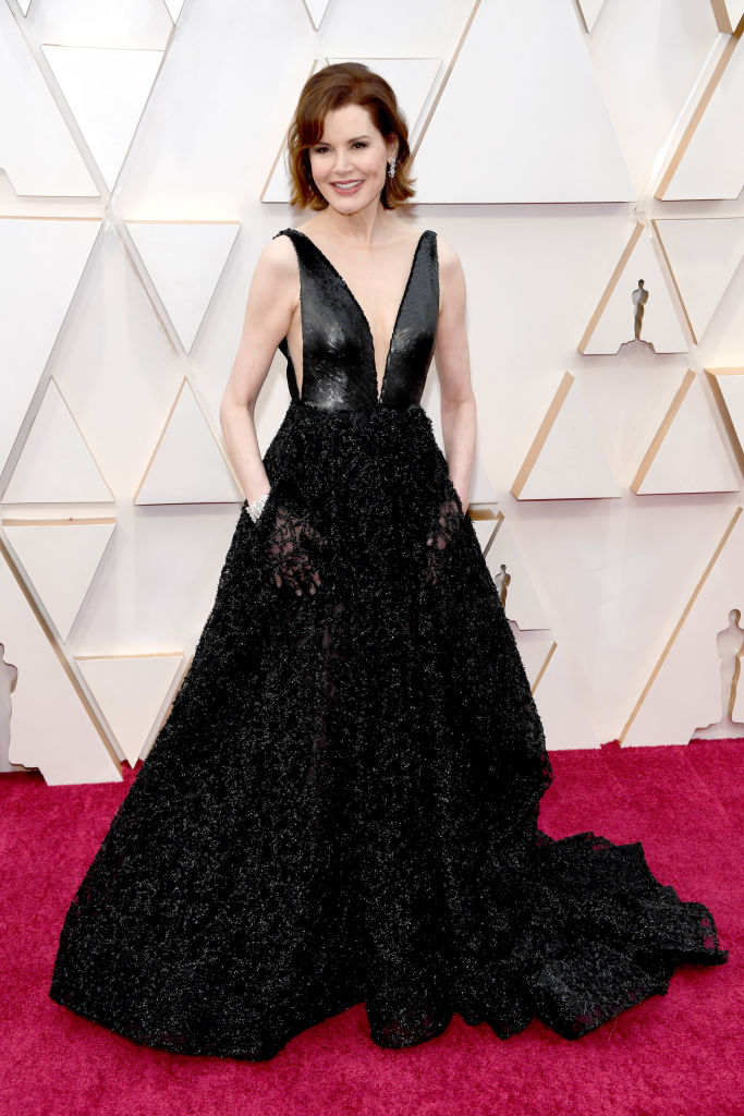 Geena Davis is a queen of award show looks and she continues the trend by wearing a gown with lace pockets. Look at those hands not being cold, but being cold in the name of fashion.