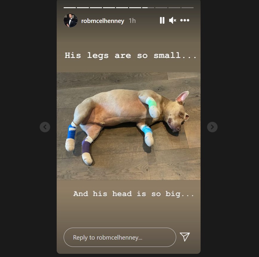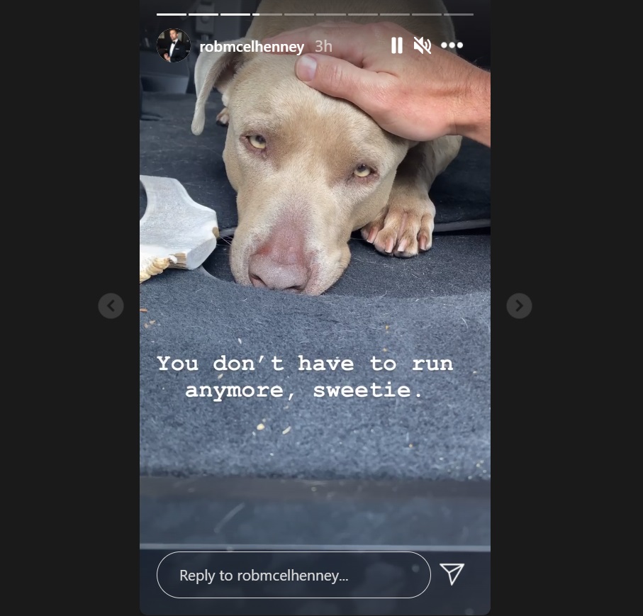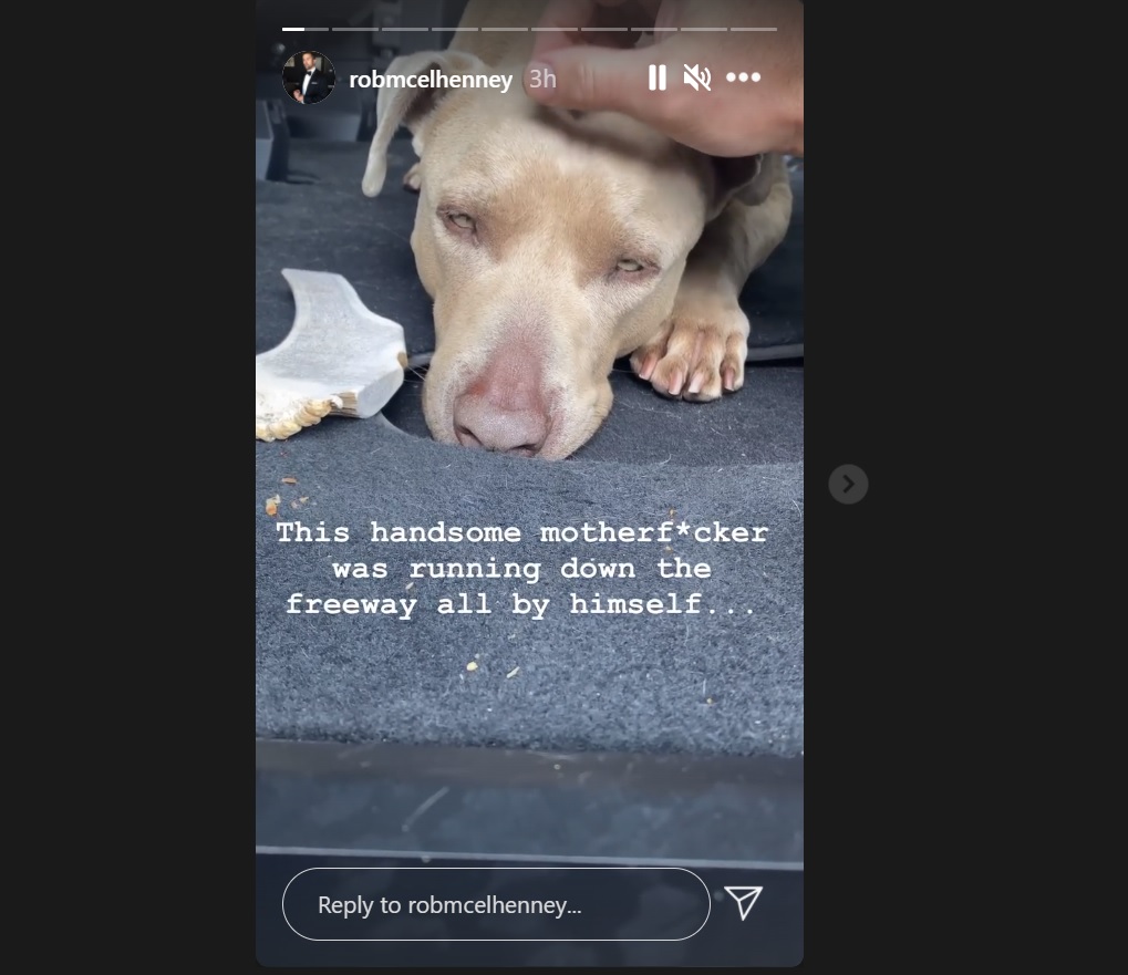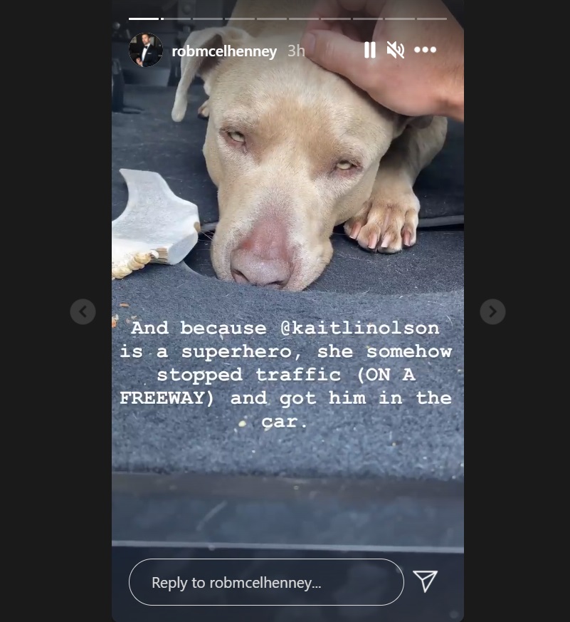According to his Instagram story, McElhenney and Olson recently saved what appears to be a pit bull from certain death. “This handsome motherf*cker was running down the freeway all by himself,” the actor explains in a video. “And because @kaitlinolson is a superhero, she somehow stopped traffic (ON A FREEWAY) and got him in the car.”