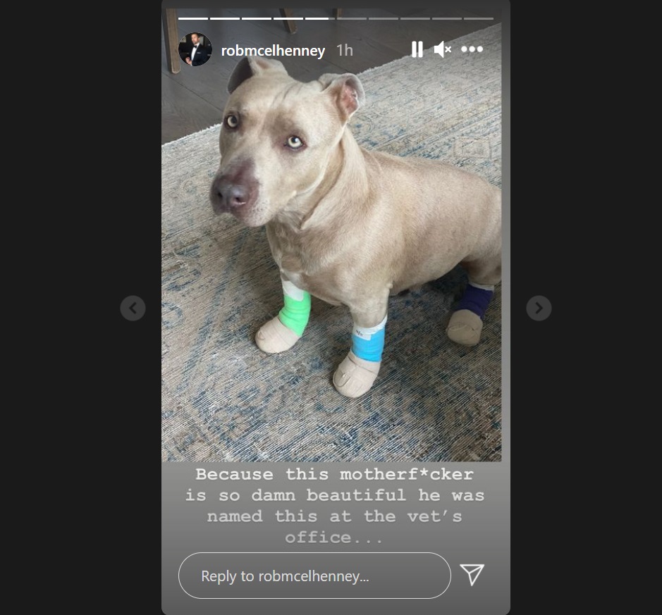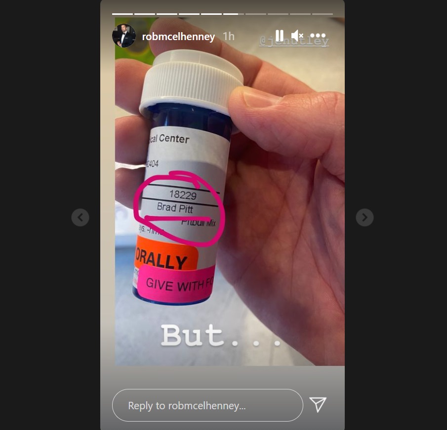 McElhenney went on to report that the dog was very tired from running. They took him to the vet, where the pup got all bandaged up. While there, the mutt was declared so beautiful that he was dubbed “Brad Pitt,” as McElhenney proved with a prescription bottle with that name printed on it. But McElhenney wasn’t completely convinced on the moniker.