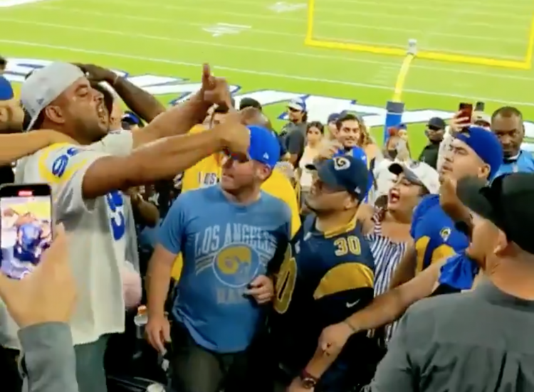 The fight began with the usual drunken trash-talking and bro-posturing and fully ignited after one woman threw a can of soda at the tense Rams fan in the Aaron Donald jersey. Despite having the upper hand, he quickly got sucked into a maelstrom of limbs (by what appears to be a flock of fellow Rams fans).