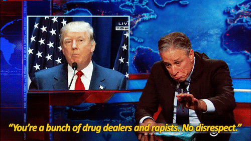 In an impromptu visit to The Late Show With Stephen Colbert, Jon Stewart gets “Trumped up” with a wig and Cheeto dust. His accent is a little more New York than Trump’s has ever been, but he gets the erratic hand gestures and rambling rant down pat.