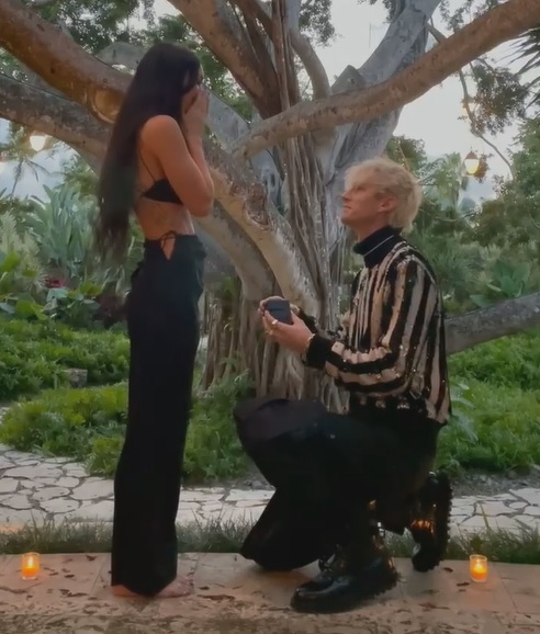 They announced the engagement, as one does these days, on Instagram. In the video, a shocked Fox wears some kind of bougie bra-top-and-PJ-pants combo while MGK, dressed like a combat referee, kneels before her at the stop of a strangely grassy staircase. He appears to slip a ring on her finger and they kiss. It all looks very staged and kind of low-budget given their mutual celebrity status.