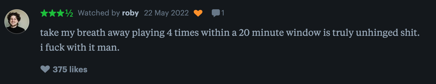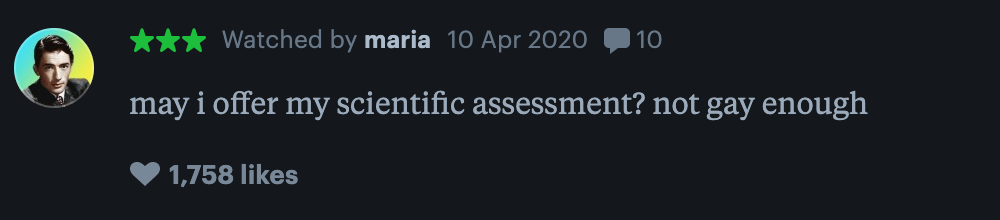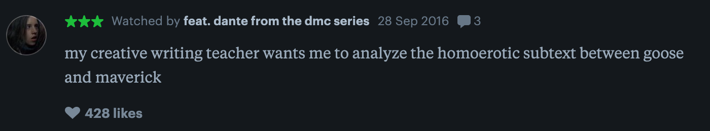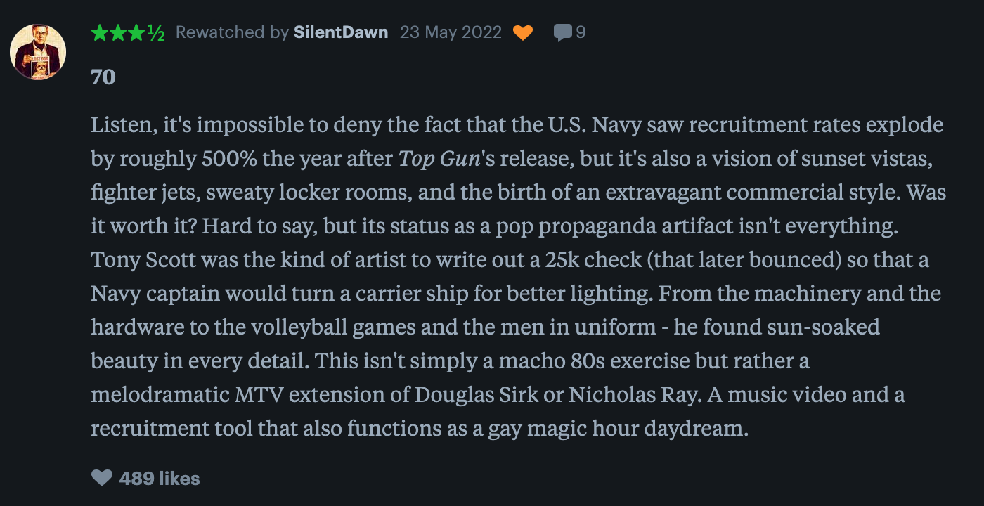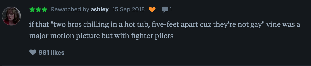 As it turns out, one of the best places for Joe Schmoe to give his honest thoughts on a film is the platform is Letterboxd.com. Naturally, these amateur reviewers have come to a consensus: Top Gun is one of the most homoerotic straight dude movies ever made; a.k.a. Call me By Your Name with jets. Here’s what they have to say.