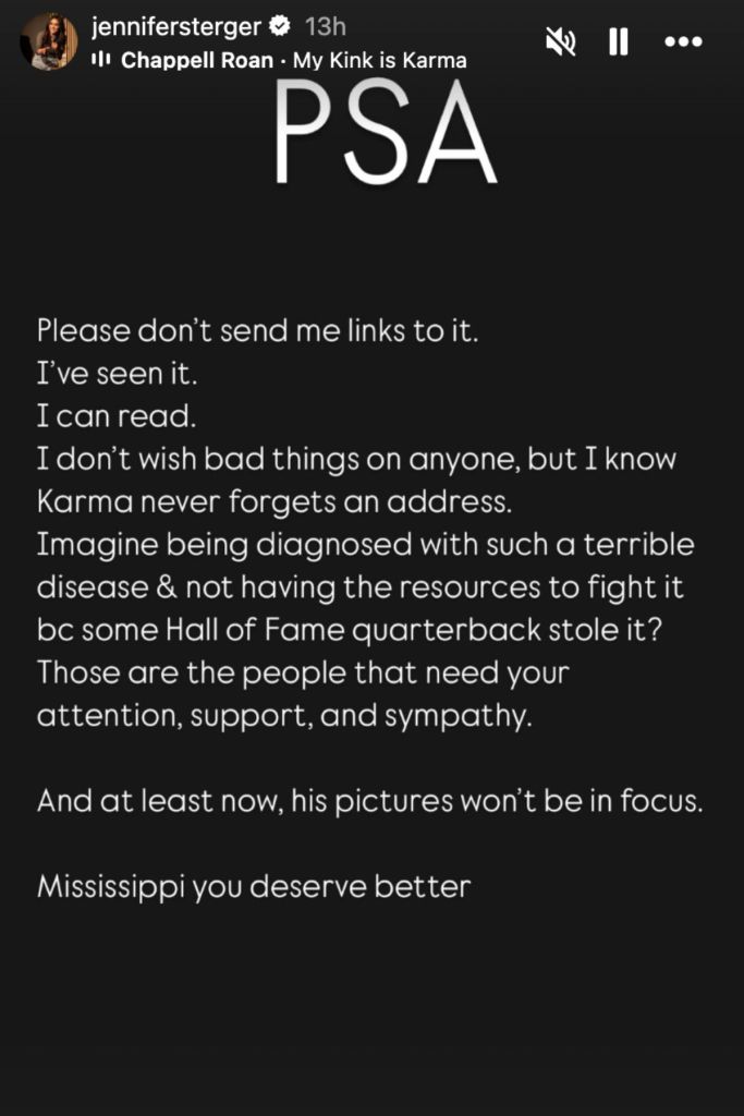 Sterger then alluded to the Mississippi welfare scandal and wrote, “Imagine being diagnosed with such a terrible disease & not having the resources to fight it bc some Hall of Fame quarterback stole it?” She added, “Those are the people that need your attention, support, and sympathy.” Before ending the statement, Sterger wrote, “Mississippi you deserve better.”
