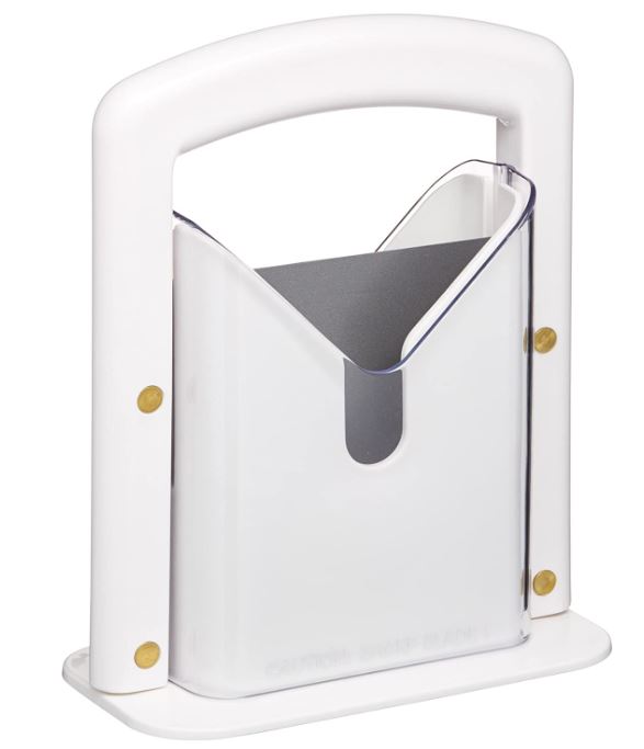Carbs are the best part of breakfast, but slicing bagels, rolls, and muffins is a pain in the ass. This handy-dandy kitchen contraption will split your bagel in half without putting your digits at risk. A cradle holds the bagel while a pair of clear acrylic safety shields protect your fingers from meeting the patented piercing blade. Say goodbye to sloppily sliced breakfast breadstuffs forever.