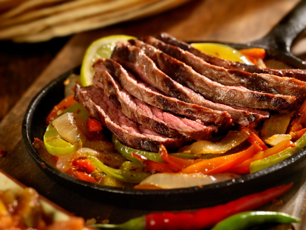 Medium Rare Grilled Steak Fajitas with Peppers and Onions in a Cast Iron Skillet - Photographed on Hasselblad H3D2-39mb Camera