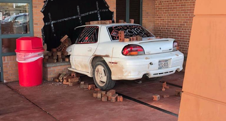 Of course what appears to be the scene of a drunk driver plowing through the wall of the high school is actually simply a half-car, black tarp and a pile of bricks.