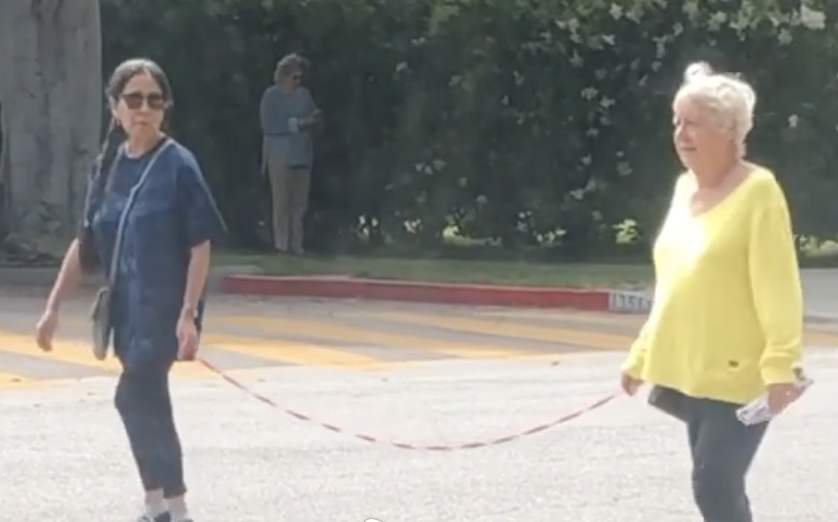 The video, taken in California, shows two women walking with the aforementioned leash between them. But if you really look closely it kind of looks like the younger woman is taking her elderly friend out for a walk on the end of a leash. Either way, we applaud their ingenuity regardless of how strange and off-putting it may be.