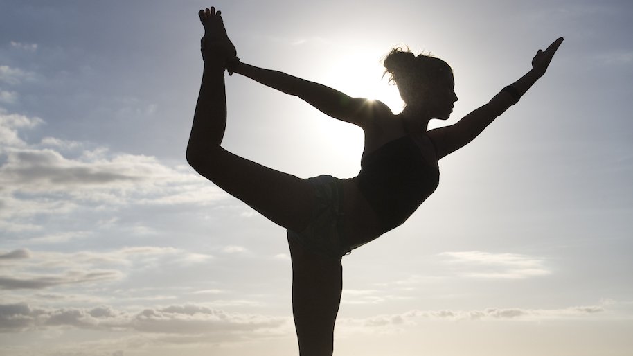 Woman in yoga pose on rocks backlit. Photo: Victoria Yee (Getty)