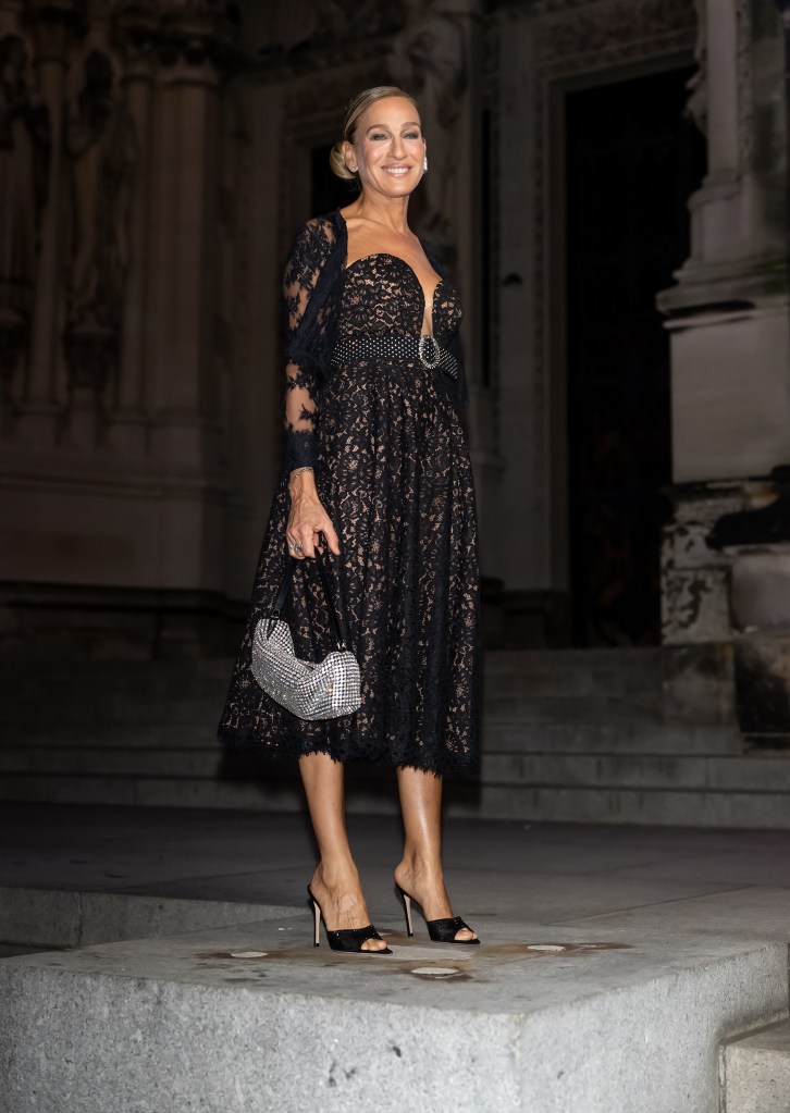 Sarah Jessica Parker almost had a Carrie Bradshaw moment in a plunging, chic Halloween-worthy dress last night for a charity gala in New York City. She attended The Golden Heart Awards benefiting God’s Love We Deliver at The Cathedral Church of St. John the Divine alongside her “Sex and the City” co-stars Kristin Davis and Cynthia Nixon. The trio looked glamorous on the red carpet, with Parker sporting a stunning black lace dress ahead of Halloween. However, her achromatic outfit contradicted her onscreen character’s aesthetics, who is best known for vibrant and bright colors.