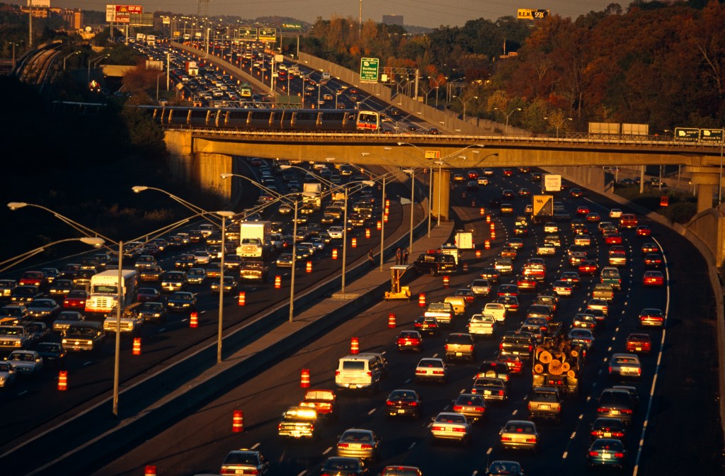 Near the junction of the 400 to Buckhead, the 401 highway divides and splits during afternoon rush-hour traffic which slows and builds up so that vehicles and cars back-up as they head home and out of Downtown Atlanta, Georgia. The inner median is coned off during some construction work which slows the traffic even more. Crossing the 5-lane road comes a train of Atlanta's own mass-transit system, the MARTA network and it approaches the overpass with care. We see the infrastructure of a modern metropolis at the busiest time of day when the exodus to get home puts the roads and feeder lanes under the most pressure. Fortunately, the weather is fine with good visibility making drivers' journeys a little shorter and more tolerable but it shows too America??s habit and dependency on car culture. (Photo by In Pictures Ltd./Corbis via Getty Images)