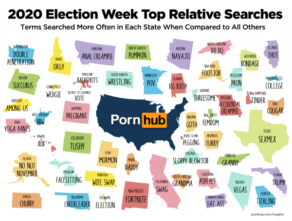 Election week was a stressful time. We were all crouched over our screens, frantically refreshing the Electoral College maps and trying to recalculate how many votes were still unaccounted for. At some point, you had to take a break from the madness. And we know what you were clicking on while you did. How? Because PornHub just released stats – in its own colorful map form – from the most-searched terms by state during election week.