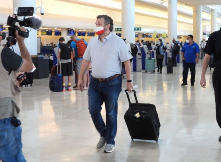 CANCUN, MEXICO - FEBRUARY 18: Sen. Ted Cruz (R-TX) checks in for a flight at Cancun International Airport after a backlash over his Mexican family vacation as his home state of Texas endured a Winter storm on February 18, 2021 in Cancun, Quintana Roo, Mexico. The Republican politician came under fire after leaving for the warm holiday destination as hundreds of thousands of people in the lone star state suffered a loss of power. Reports stated that Cruz was due to catch a flight back to Houston, Texas. (Photo by MEGA/GC Images)