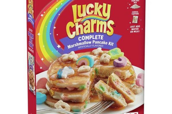 We’re talking about another combination made in nostalgic breakfast heaven: Lucky Charms Complete Marshmallow Pancake Kit. Yes, you read that right. It’s a pancake kit that pairs the sweet, leprechaun-adorned, marshmallow-filled childhood favorite cereal with the gluten-filled, rich goodness of a pancake.