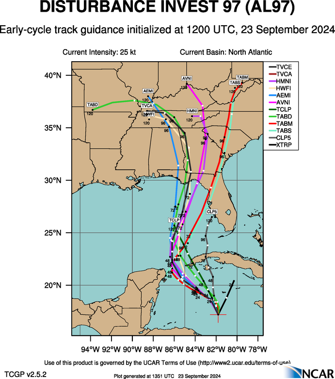 Most projections from the National Center for Atmospheric Research (NCAR) on September 23 predict that the tropical storm, labeled as AL97, will hit Florida. The tracked path of the system will be clearer over the next few days, but it is recommended that residents in Florida and other areas along the Gulf Coast begin to make preparations for the oncoming storm.