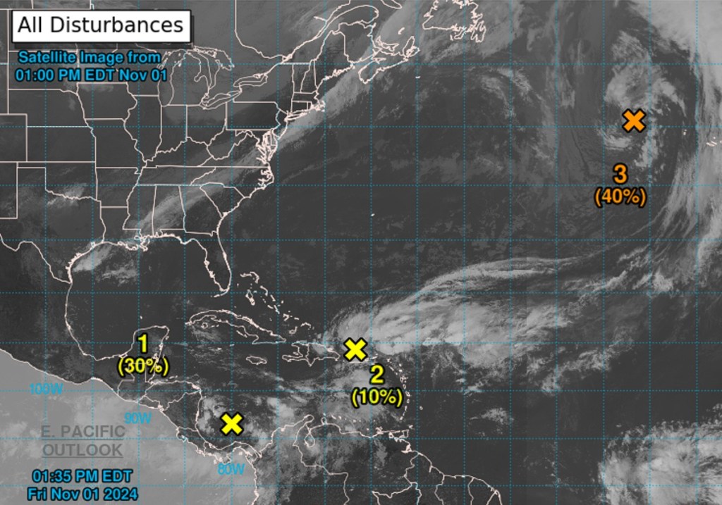 There are three disturbances that could turn into the next hurricane in early November according to the NHC, with a system in the Caribbean having the highest chance of turning into a named storm.
