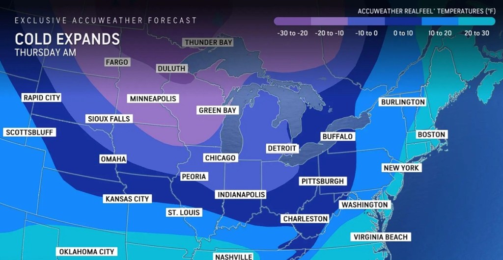 At the same time, air pulled from the Arctic will bring subzero temperatures throughout the Midwest and the Northeast, per AccuWeather. The greatest freeze will occur between Wednesday night and Thursday morning, as Minnesota, Wisconsin, North Dakota, and Michigan could reach wind chill temperatures from -10 to -30 degrees Fahrenheit. Much of the other states in the Midwest and Northeastern US are expected to feel a sting as well with highs in the single digits and low teens.