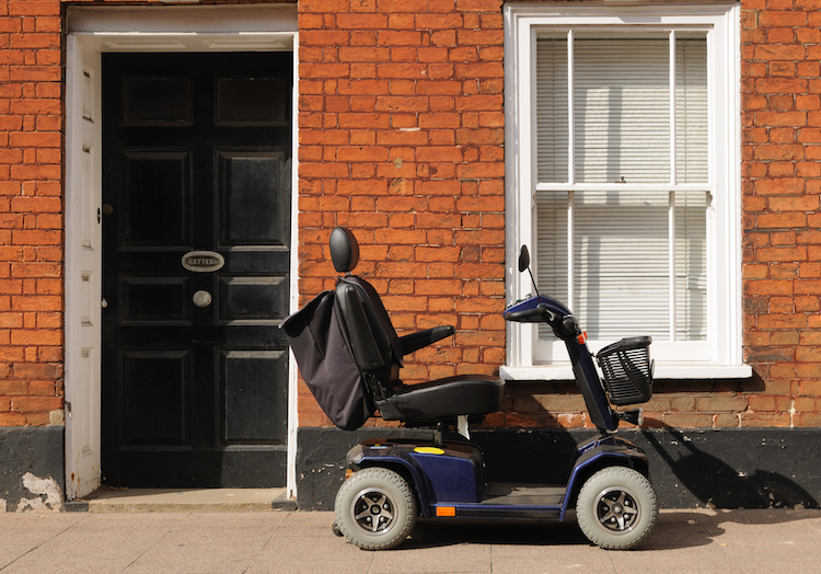 "Mobility scooter parked outside a house in a Suffolk town, England."