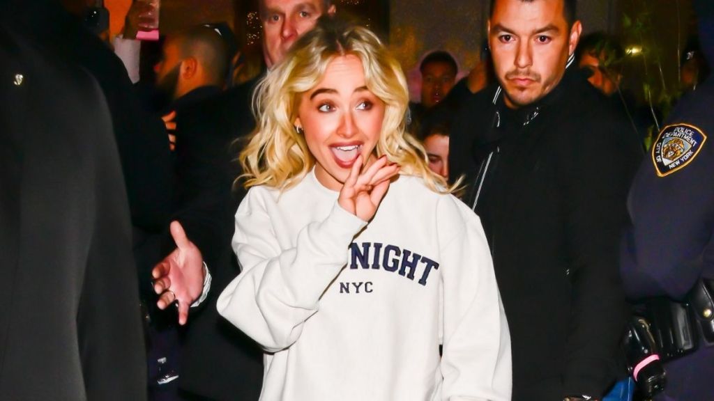As seen in the above photos, Carpenter — who greeted onlookers as she exited NBC Studios — paired her white Late Night NYC sweatshirt with black sheer tights. She topped off her look with black heels.