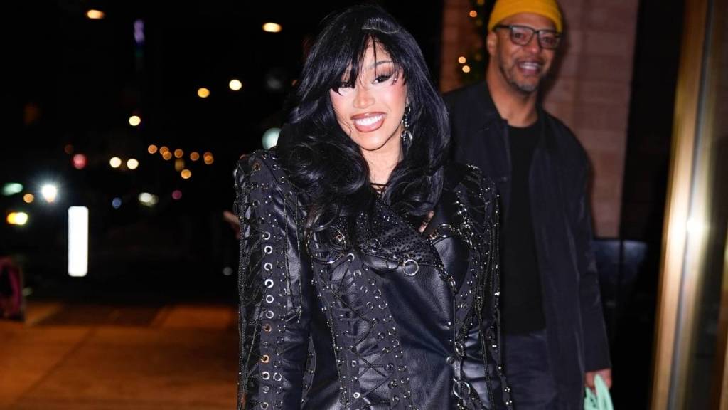 Cardi B stepped out in style for her SNL appearance in a bold latex top. The rapper wore a deep burgundy, form-fitting piece with a high collar and a daring cutout at the chest. She styled it with a fitted pencil skirt, balancing boldness with elegance.