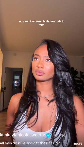 In the now-viral TikTok, Nicole jokingly reenacted a scenario in which she responds bluntly to a man complimenting her. The onscreen caption read, “No valentine cause this is how I talk to men.” Beneath the post, she added another sharp line: “All men do is lie and get their hair cut. Leave me alllllooooooone.”