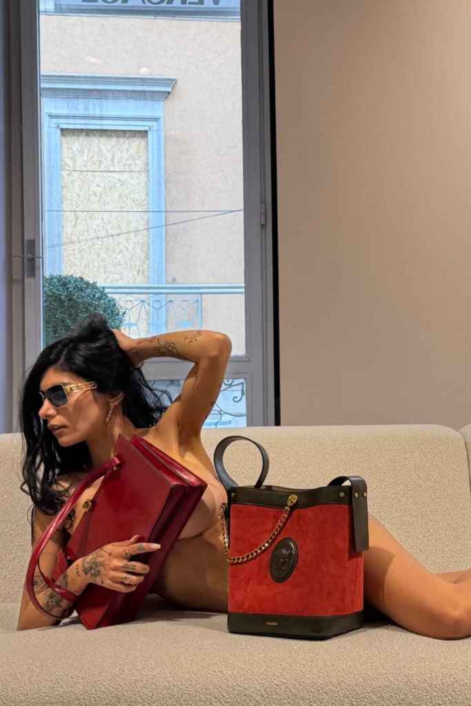 In the recently posted photos, Khalifa posed confidently on a cream-colored couch while holding a bright red Versace handbag across her chest, effectively using it as her top. The unique styling created a striking contrast against the neutral background and added a high-fashion editorial feel to the shoot.