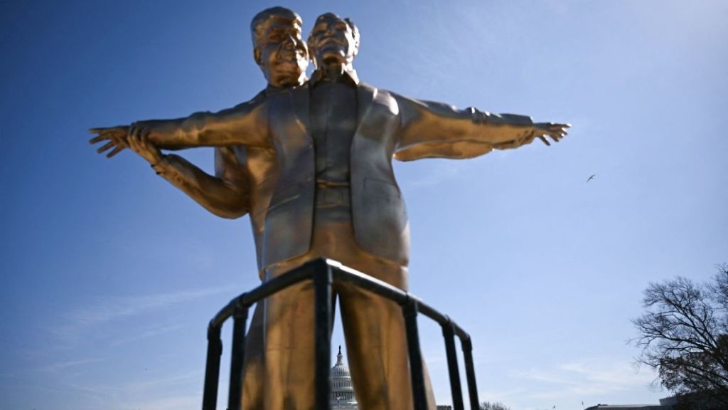 Donald Trump and Jeffrey Epstein’s Titanic pose statue appears at Washington’s National Mall