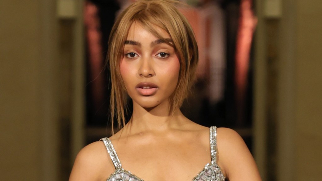 PinkPantheress attended the Valentino show wearing a sleek black slip dress. The dress featured a bold V-neckline with floral crystal embellishments along the bust. It also had thin, embellished straps. She styled the look with pink open-toe heels.