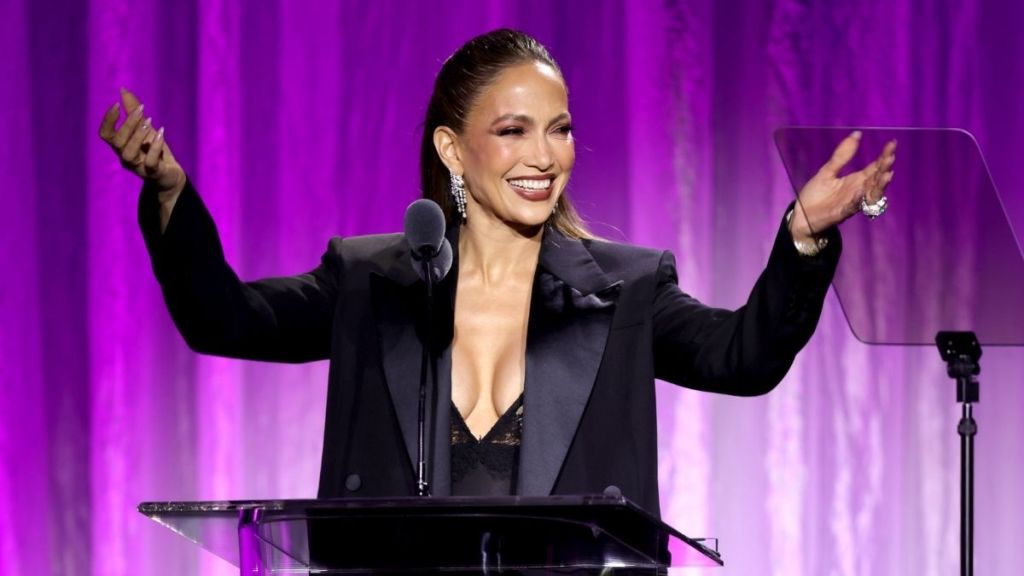 The plunging neckline of the slip dress added a bold element, while the blazer kept the look polished. The combination allowed Lopez to balance elegance with confidence. Her accessories added the finishing touch. Lopez wore sparkling drop earrings and a statement ring that added just the right amount of glamor. She styled her hair in a sleek half-up, half-down do and opted for bronzed makeup with a deep-toned lip.