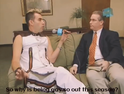 Before the flamboyant Austrian showed up on the big screen, Bruno appeared in comedy sketches on Da Ali G Show. On one such occasion, Bruno interviewed Pastor Quinn, a man who believes homosexuality is a sin—they call him the “gay converter.” Quinn quickly tells Bruno he’s married, beginning an interview that is both uncomfortable and extremely hilarious.